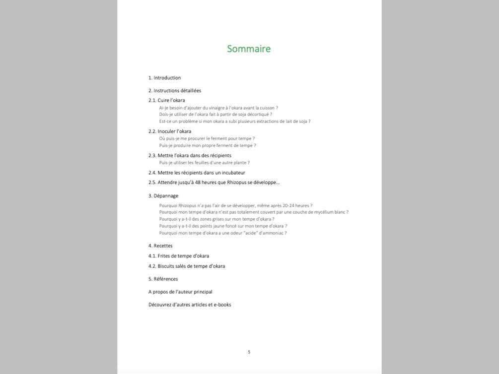 La fabrication d'aliments fermentés n'est pas toujours facile, et la fabrication de tempe d'okara nécessite des conditions légèrement différentes de celles mises en oeuvre pour la fabrication de tempe fait à partir de graines de soja. Ce guide vous montrera comment mettre en œuvre facilement le processus de fermentation. Pour chaque étape, vous pourrez profiter de photos, de descriptions précises et d'explication des facteurs clés pour réussir. En cas de difficultés, une dernière section vous aidera à découvrir quel a pu être le problème : était-ce la température, le taux d'humidité, la disponibilité en oxygène ?